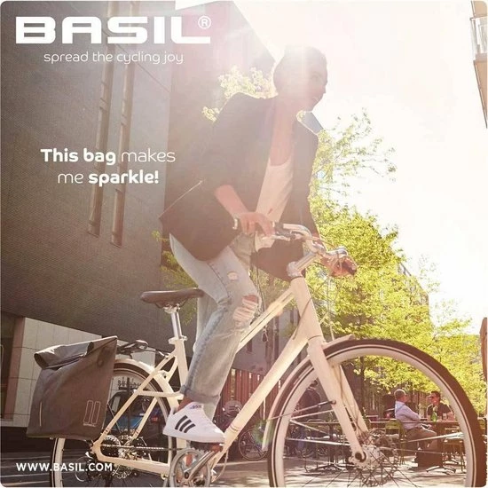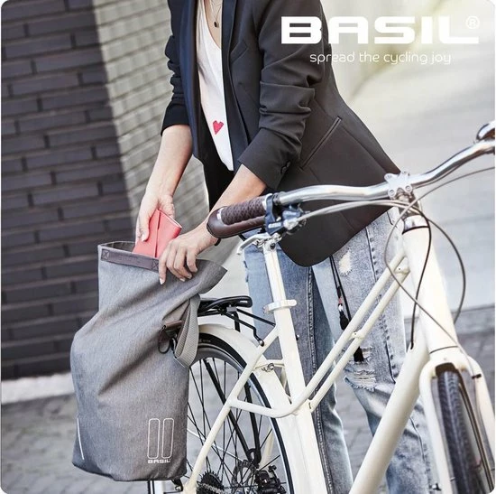 De Basil City shopper past bij het uptempo van de city: werk, vrienden, uitgaan, naar de markt of juist even helemaal zen na een uurtje yoga. De shopper is niet te zwaar, niet te groot en toch ruim met een inhoud van 14 tot 16 liter. De tas is ook sterk genoeg om flink wat spulletjes of boodschappen mee te nemen. De waterkerende vouwsluiting met magneet voorkomt inregenen. De grijze tas bevestig je makkelijk aan je bagagedrager met het Hook-On systeem of hang je gewoon nonchalant over je schouder met de afneembare schouderband. Daarnaast draag je de tas in de grey melee kleur comfortabel met de vegan leder handgrepen. Aan veiligheid is ook gedacht, de tas is namelijk voorzien van reflectie op alle zijden en een bevestigingsmogelijkheid voor LED-verlichting. In de binnenvak met rits berg je de kleinere en meest waardevolle spullen op. Eigenschappen: Shopper en fietstas in ??n. Draag de fietsshopper over je schouder, in je hand of aan de bagagedrager van je fiets. Met het Hook-On systeem bevestig je de shopper snel achterop jouw fiets. Alle zijden van de tas zijn voorzien van reflectie. Dat maakt je beter zichtbaar.