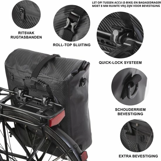 Achterop de tas vind je een rits met daarin twee verende knijpklemmen, de Quick-Locks. Open het vak volledig en je kunt nu de Quick-Locks gebruiken voor bevestiging. Knijp deze in, hang de tas aan je bagagerek en laat los. De verende klemmen zitten nu vast om het ronde frame van je bagagedrager. Onderaan de tas zit nog een extra bevestigingsriem die aan de bagagedrager vast gemaakt kan worden voor extra zekering. Bekijk de foto?s om goed te zien hoe simpel het werkt. Je bent in enkele seconden klaar!