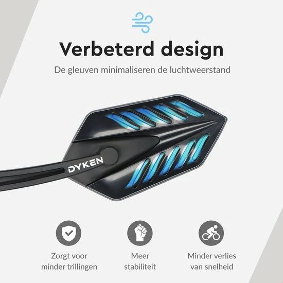 Slimme gleuven in de achterkant minimaliseren de luchtweerstand. Zo blijft de achteruitkijkspiegel stevig op je stuur zitten en zal ?ie tijdens het rijden minder trillen.