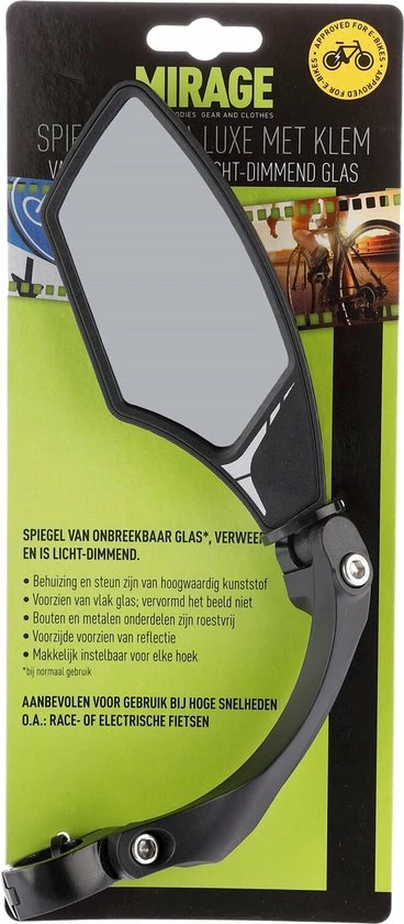 Met deze spiegel krijg je direct een goed beeld van het verkeer achter je. De spiegel bevestig je eenvoudig aan de linkerbinnenkant van het stuur. Verder is de spiegel ook geschikt voor een elektrische fiets. De spiegelarm klapt weg bij een botsing en heeft op de achterzijde een reflector zitten, zodat je ook in het donker altijd goed zichtbaar bent.