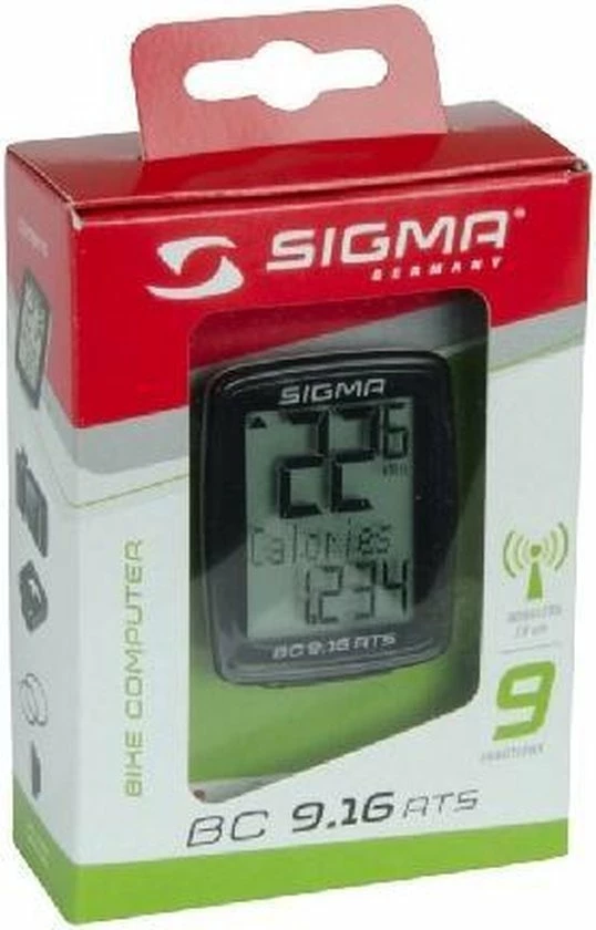 De Sigma BC 9.16 fietscomputer blinkt uit door de eenvoud en kan dankzij de ATS techniek draadloos diverse gegevens, waaronder snelheid en afstand, overdragen. Het display ziet er zeer sportief uit en zal zeker niet misstaan op jouw racefiets of mountainbike! Naast de diverse basisfuncties kan deze veelzijdige fietscomputer ook het aantal verbruikte calorie?n en de maximale snelheid weergeven. Ook een automatische start- en stopfunctie is aanwezig. Met het meegeleverde bevestigingsmateriaal is de computer snel en gemakkelijk zonder gereedschap te monteren!