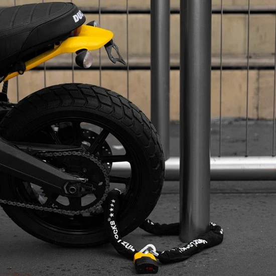 150cm is de optimale lengte voor een kettingslot. Hij is lang genoeg om om een paal te doen en niet te lang, waardoor het gewicht meevalt.